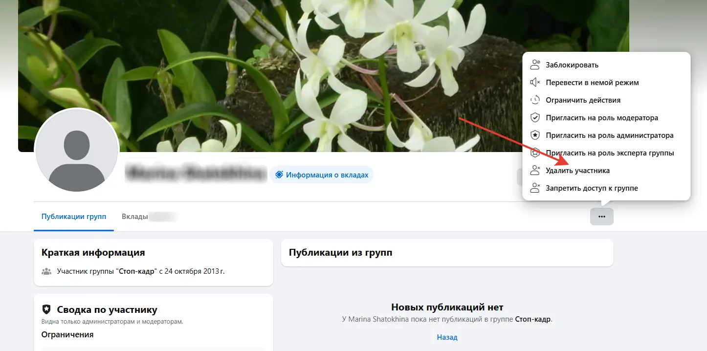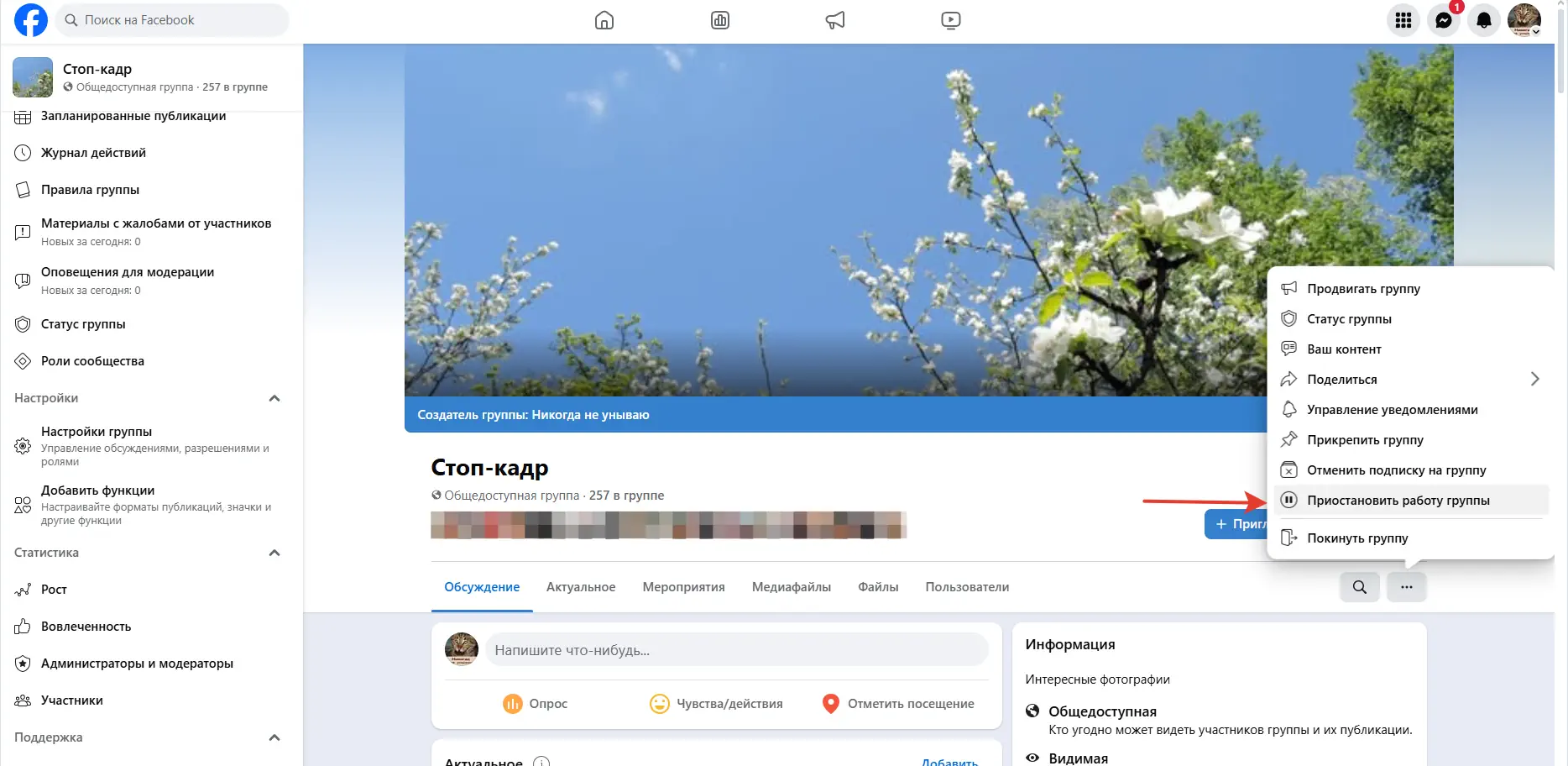 Как приостановить группу в FacebookИтак, я приняла решение заархивировать группу до лучших времен — на Фейсбуке есть такая возможность. При этом в группе остается возможность читать сообщения и просматривать изображения, но добавлять новые сообщения и комментарии нельзя. Отсутствует и добавление новых участников. И только админы и модераторы могут совершать кое-какие действия. Чтобы приостановить группу, нужно в горизонтальном меню группы (под заголовком) кликнуть на многоточие и в выпавшем меню выбрать пункт «Приостановить работу группы». После этого на экране появится всплывающее окно, где вас попросят указать, почему вы хотите приостановить работу группы. Далее появляется еще одно всплывающее окно, где вас предупреждают о том, что произойдет, если вы приостановите группу, и предлагают ознакомится с некоторыми советами — уговаривают не принимать радикальных решений. Пусть уговаривают. Приостановить группу — это еще не самое радикальное решение. Смело кликаем по кнопке «Далее». Получаем последнее всплывающее окно, где предлагается повесить объявление о приостановке группы с объяснением причин. И, наконец, нажимаем на кнопку «Приостановить работу группы». Любуемся полученным результатом. Как видно на скриншоте, представленном ниже, в любой момент можно возобновить работу группы. Как удалить группу в FacebookА вот и самое радикальное решение. Умер, так умер. Но, к сожалению, кнопка «Удалить группу» в Фейсбуке отсутствует. Чтобы удалить группу, необходимо методично исключить из нее всех до единого участников. Для этого кликаем по количеству участников в группе. Теперь необходимо открыть весь список пользователей, для чего проходим по ссылке «Смотреть все». После этого абсолютно каждого участника нужно исключить из группы. Кроме себя, разумеется. Капитан тонущего судна должен последним его покинуть. Иначе никто, кроме вас, не сможет удалить всех участников. Чтобы удалить участника из группы, нужно кликнуть по его имени и пройти в карточку участника группы. Именно там, с помощью меню с многоточием, можно выполнить необходимое действие. В случае моей группы, нужно было бы выполнить 256 одинаковых, занудливых действий. А как быть, если участников группы тысяча и больше? Однако глаза боятся, а руки делают. Эта миссия выполнима. Как только все участники группы исключены и вы, администратор, остались в гордом одиночестве, можете с чувством выполненного долга покинуть группу. В этом случае появится всплывающее окно с предупреждением, что группа будет удалена. Необходимо подтвердить это действие.