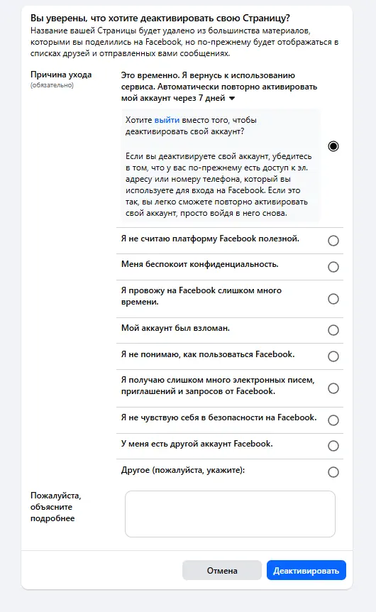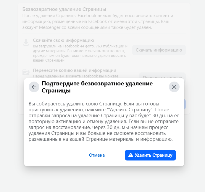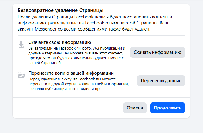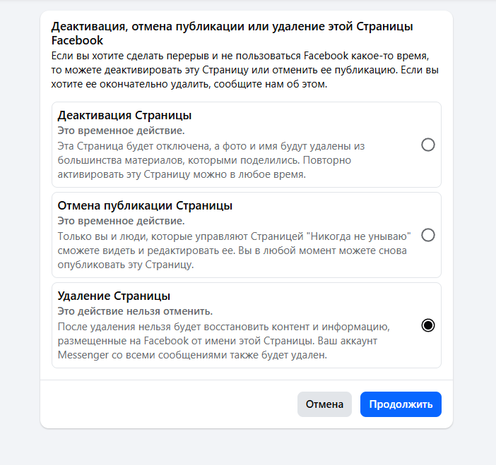Вчера я рассказала, как приостановить или удалить группу в Facebook. Если стало долго, сложно заходить во вражескую соцсеть, запрещенную в России, либо нет желания, можно удалить и фан-страницу. Всё, что занимает слишком много времени и не приносит пользы, имеет смысл удалять. Если вы читаете эту статью, возможно, ваша фан-страница стала вам в тягость. Можно, конечно, ее не удалять, а благополучно забросить, но, раз уж приняли решение… Политические баталии, бывает, разворачиваются даже под фотографиями с котиками. Тем более, что к заброшенному периодически возникает желание вернуться. Далее статья с исправлениями от 26.11.2025. С момента написания поста в 2022 г. процесс удаления фан-страницы изменился. Удалить фан-страницу очень просто. Заходим в Настройки страницы и выбираем пункт «Доступ и управление». Теперь мы можем увидеть три варианта действий. «Деактивация Страницы» и «Отмена публикации Страницы» - это мягкие действия. Если вы хотите, скажем, дождаться лучших времен, чтобы продолжить вести страницы - один из этих вариантов для вас. Вы просто приостановите ведение страницы на какой-то срок, удобный для вас. В случае деактивации страницы от вас потребуют указать причину этого действия. Можно выбрать любой пункт - это не принципиально. В любое время страницу можно повторно активировать в настройках своего профиля. Второй вариант - отмена публикации страницы - отличается от первого только тем, что страница останется видна администраторам и модераторам и будет доступна им для редактирования. Этот режим полезен только в том случае, если необходимо разгрести горы мусора - удалить потерявшие актуальность сообщения и ненужные комментарии. Третий вариант, «Удаление Страницы», - радикальный. Это безвозвратное удаление. Выбирайте этот вариант, если страница вам не нужна, а отдавать ее кому-либо вы не собираетесь. Далее читаем предупреждение, что контент страницы нельзя будет восстановить. Также нам предложат скачать всю информацию, опубликованную вами на странице, либо перенести копию страницы в другой сервис. При желании можно это сделать. Затем нажимаем кнопку «Продолжить». После Фейсбук попросит в сплывающем окне подтвердить, что вы действительно хотите удалить страницу. Нажимаем кнопку «Удалить страницу», и ждем месяц. По прошествии 30 дней запустится процесс окончательного удаления фан-страницы. Если вы передумали, в течение 30 дней страницу можно восстановить точно так же, как при деактивации.