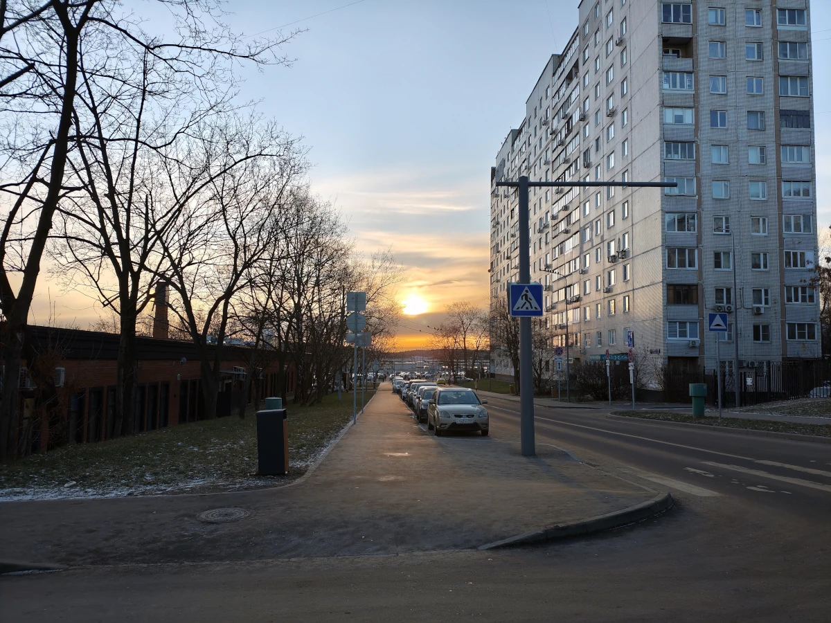 Камера Sony IMX882 очень неплохо справилась с цветопередачей при съемке против утреннего солнца. Опять же, с зеркалкой не сравнишь, но против камер предыдущих моделей Xiaomi просто замечательно. Качество ночной съемки терпимое. Свет от фонарей, как его передала камера, конечно, далек от идеала, но намного лучше, чем это делали предыдущие модели.